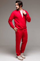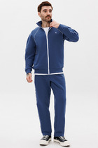 Костюм мужской из ткани высокого качества. Кофта на молнии, ворот-стойка, рукава-реглан. Рукава на манжете, сбоку по рукаву до локтя цветная вставка с печатью. Спереди на кофте два кармана на молнии. Слева на груди печать-надпись. Брюки на манжете. Спереди два кармана на молнии, один сзади без молнии. Сбоку на брюках до колена цветная вставка с печатью.