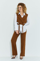 Костюм женский из трикотажного полотна "кулирка" в комбинации двух видов: гладкокрашенного и с рисунком в крупную клетку, сочетающихся между собой по цвету, состоящий из джемпера и брюк. Джемпер - из гладкокрашеного полотна, свободного покроя, с длинными втачными рукавами и приспущенными плечами, с горловиной овальной формы и тематическим принтом, выполненным в технике шелкографии. Горловина, нижние срезы рукавов и низ изделия обработаны подгибкой с отделочным широким кантом контрастного цвета. Брюки - из полотна в клетку, свободного покроя, прямые, на притачном поясе с эластичной тесьмой внутри, с карманами в боковых швах. Нижние срезы обработаны подгибкой.