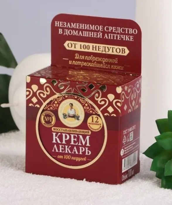 Крем лекарь восстанавливающий, 100 мл. Создан по традиционному рецепту сибирской травницы Агафьи. Его живительная сила заключается в уникальном составе, который состоит из 12 натуральных медовых компонентов, специально подобранных для сохранения здоровья и красоты Вашей кожи. Целебный состав крема состоит из 12 активных медовых компонентов, которые глубоко проникают в кожу, питают и активизируют процессы регенерации тканей, оказывают противовоспалительное и заживляющее воздействие, эффективно восстанавливая повреждения. Пчелиное маточное молочко содержит большое количества витаминов, минеральных веществ и аминокислот, оно глубоко увлажняет и успокаивает кожу. Перга, уникальное по своим свойствам вещество, которым пчелы выкармливают своих рабочих собратьев. В ней содержатся все витамины группы В, каротин, природные антибиотики, а также витамин Р, стимулирующий восстановительные и заживляющие процессы в клетках кожи. Горный и Алтайский мед улучшают микроциркуляцию крови и иммунитет. Прополис оказывает антибактериальное действие. Цветочная пыльца, незаменимый источник протеинов, тонизирует и глубоко питает кожу. Пчелиный воск образует на коже невидимую пленку, которая предотвращает обезвоживание и обеспечивает длительную защиту. Мумие оказывает очищающее и противовоспалительное действия. Гречишный, малиновый и лесной мед заживляют, оздоравливают и разглаживают кожу, делая ее свежей и бархатистой. Вы можете применять этот крем ежедневно, для защиты кожи лица и тела в любое время года, а также, как универсальный заживляющий и восстанавливающий крем для всей семьи!