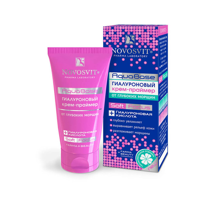 Гиалуроновый праймер совершенствует кожу лица, прекрасно скрывает морщинки и другие неровности на лице. Обладает глубоким увлажняющим и выравнивающим эффектом. Входящий в состав комплекс Soft Focus мгновенно делает кожу шелковистой, придает ей деликатное внутреннее сияние, улучшает цвет лица. Soft Focus (обеспечивается уникальными светорассеивающими частицами) позволяет матировать кожу, скрыть морщины и недостатки. Инновационная косметика (FARMA + BEAUTY) объединившая достижения медицины и косметологии AquaBase Специальная освежающая текстура праймера «тает» на коже, выравнивает микрорельеф, скрывает морщины и поры, создавая безупречно ровную поверхность для нанесения макияжа. Суперувлажнитель гиалуроновая кислота улучшает состояние кожи, создаёт увлажняющую «сеть», насыщает её влагой, способствует естественному разглаживанию морщин