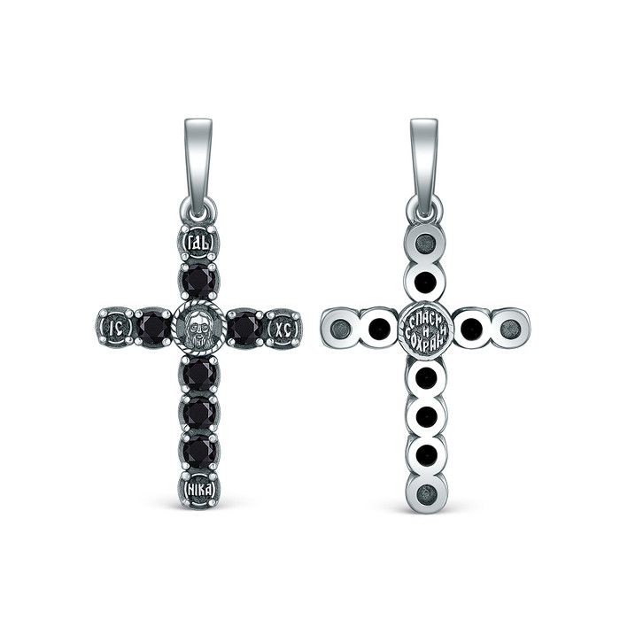 Крест из чернёного серебра с чёрной синтетической шпинелью - Спаси и сохрани ПК-