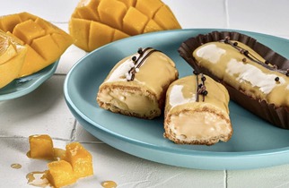 Пирожное Манго-маракуйя - на хрустящей песочной основе сочное пюре манго, слой ванильного мусса и ароматный мусс из манго и маракуйи.