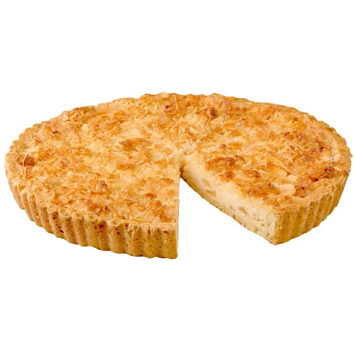 Богатый по вкусу торт с французским акцентом: на песочном корже обилие сырной начинки и грушевых долек, щедро декорированных хрустящими миндальными лепестками.