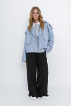 Куртка женская с центральной бортовой застежкой на кнопки. Спинка простая. Перед с боковыми накладными карманами. Рукав втачной одношовный с широкой подгибкой. Воротник-капюшон с центральной и боковыми частями и застежкой на 2 кнопки. Куртка на подкладке.