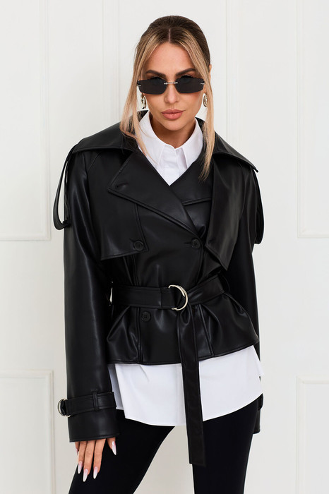 Куртка с центральной двубортной застежкой на петли и пуговицы, втачным воротником с отрезной стойкой. По переду с отлетными кокетками, рельефами, выходящими из плеча. Спинка со средним швом, отлетной кокеткой, средним швом. Рукав длинный, реглан. По плечевым швам и низу рукава- паты со шлевками. Куртка со сьемным поясом.