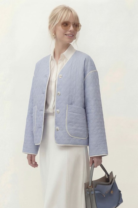 Куртка свободного кроя, облегченная, без подкладки и синтепона. Линия плеча спущена, рукав длинный. V-образный вырез горловины. Застежка однобортная на петли и пуговицы. По бокам накладные карманы. По спинке средний шов. Шов втачивания рукава, низ рукава, горловина, борт, карман, средний шов спинки обработан окантовкой из отделочной ткани.