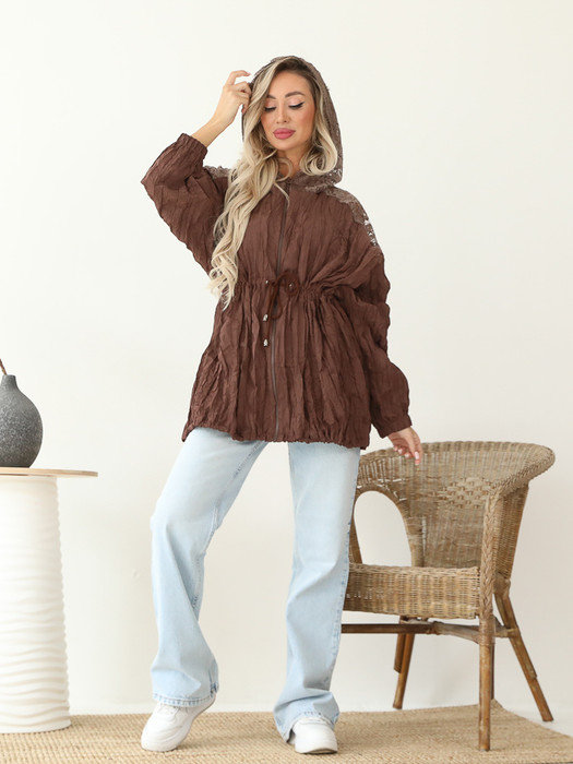 Эффектная куртка-ветровка из текстильной "жатой" ткани коричневого цвета. Капюшон и кокетка спинки выполнены из кружева. Куртка со спущенной проймой и втачными рукавами. Рукава обработаны резинкой. Линия талии дополнена кулиской. Застежка по переду на молнию. Длина изделия по спинке от плечевого шва до низа изделия — см. Рост фотомодели — 170 см.