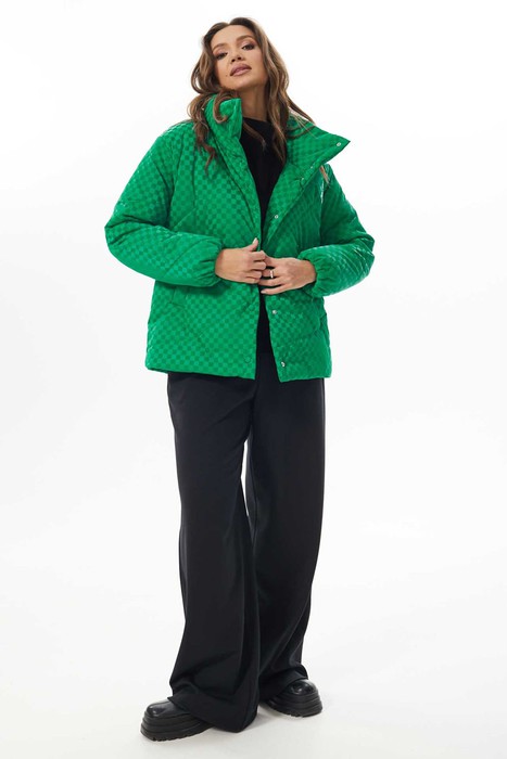 Куртка женская утеплённая осень-зима,  прямого силуэта, со спущенными плечами, выполнено из ткани лаке на утеплителе изософт. По переду прорезные карманы с листочкой и застёжка на 7 кнопок. Воротник стойка. Рукава одно шовные втачные. Низ  рукавов собран на эластичную тесьму резинку. Подкладка простёгана с утеплителем изософт