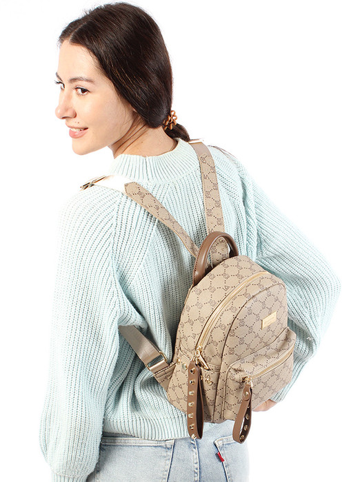 Рюкзак выполнена из экокожи канва. Детали: 1 короткая ручка 15см., 2 регулируемые лямки на плечо укрепленные стропой от 50см до 95см.  Внутри изделия: 1 отделение на молнии, 1 карман на молнии, 1 евро карман, 1 карман открытый. Снаружи изделия: 1 карман на молнии спереди изделия, 1 карман на молнии сзади изделия и 2 кармана по бокам изделия. Брендированная подкладка из хлопка. Металлическая брендированная фурнитура золотистого цвета. В комплекте фирменный пыльник.