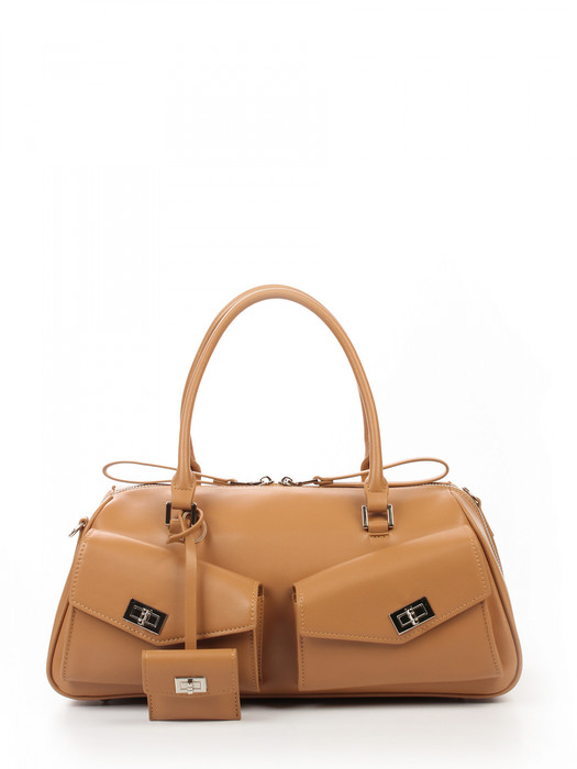 Сумка женская выполнена из натуральной кожи. Детали: 2 ручки 45 см, 1 регулируемая ручка на карабинах от 110 см до 135 см. Сумка на ножках. Каркас сумки: жесткий.  Фактура кожи: гладкая. Застежка: молния. Внутри изделия: 1 отделение, 1 карман на молнии, 1 открытый карман. Снаружи изделия: 1 карман на молнии сзади, 2 кармана на клапанах спереди. Подкладка из хлопка. Металлическая брендированная фурнитура серебристого цвета. В комплекте фирменный пыльник для хранения сумки.