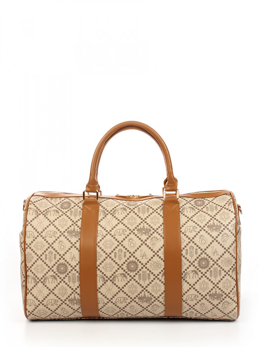 Сумка дорожная выполнена из экокожи «канва». Детали: 2 ручки по 40 см, 1 длинный регулируемый ремень на карабинах. Внутри изделия: 1 отделение на молнии, 1 карман на молнии, 1 карман открытый. Снаружи изделия: 1 карман на молнии с оборотной стороны изделия, 2 кармана на магнитных кнопках по бокам изделия. Брендированная подкладка из хлопка. Металлическая брендированная фурнитура золотистого цвета.