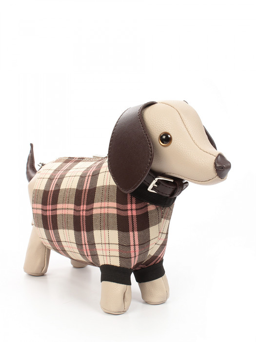 Сумка в виде таксы выполнена из экокожи. Детали: 1 отстегивающаяся ручка от 110 см до 125 см. Внутри изделия: 1 отделение на молнии. Брендированная подкладка из хлопка. Металлическая брендированная фурнитура серебристого цвета. В комплекте фирменный пыльник для хранения сумки.