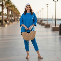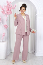 Элегантный женский комплект - двойка: блузон, брюки.Блузон прямого силуэта с разрезами по боковым швам.Застёжка - отрезная планка с петлями и пуговицами. Воротник рубашечный на отрезной стойке.По переду вставка из отделочного материала. По спинке кокетка и талевые вытачки.Брюки классические, зауженные к низу, с нормальной высотой сидения, комфортной посадки, на обтачке.Длина блузона по спинке 84 см. Длина рукава - 25 см. Длина брюк по боковому шву 102 см.