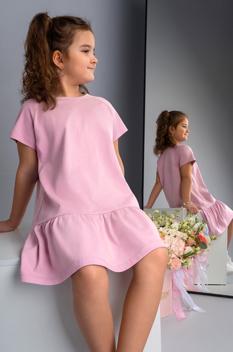 Детское платье для девочки выполнено из натурального 100% хлопка. А-силуэт с широким воланом добавляет легкости и изящества. Нежный розовый цвет подчёркивает лёгкий и воздушный образ.