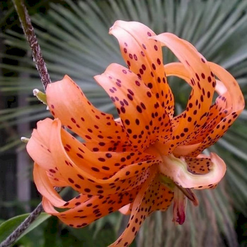 Флоре Плено - высота растения 120 см. Цветок многослойный оранжевый с частым бордовым крапом.