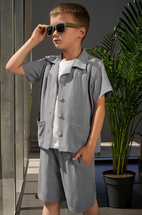 Лёгкий, как летний бриз, и стильный во всем — льняной костюм для мальчика готов даже к жарким дням. покойный серый цвет и свободный крой добавляют непринуждённости и комфорта в каждом движении.