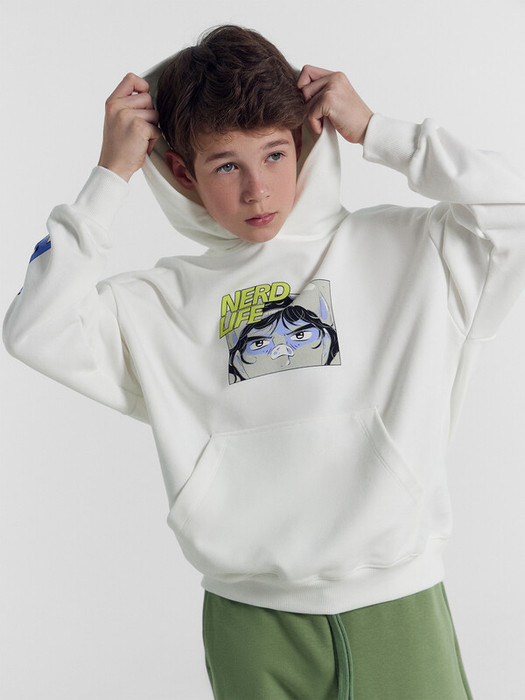 Анорак изготовлен из трикотажного полотна футер. Анорак свободного силуэта (оверсайз), с капюшоном. Горловина округлой формы. Капюшон со средним швом, на подкладке из осн. полотна. Плечо спущено, рукав втачной длинный. По низу рукава отрезная манжета из рибаны.
