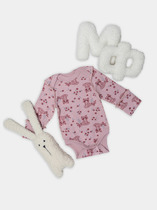 Боди выполнено из интерлока. Спинка и перед цельнокроенные. Спинка с переходящей кокеткой и цельнокроенной ластовицей. Горловина круглая, окантована бейкой из основног полотна. Припуски верхних и нижних срезов переда и спинки окантованы бейкой из основго полотна. Рукава длинные, втачные, одношовные.