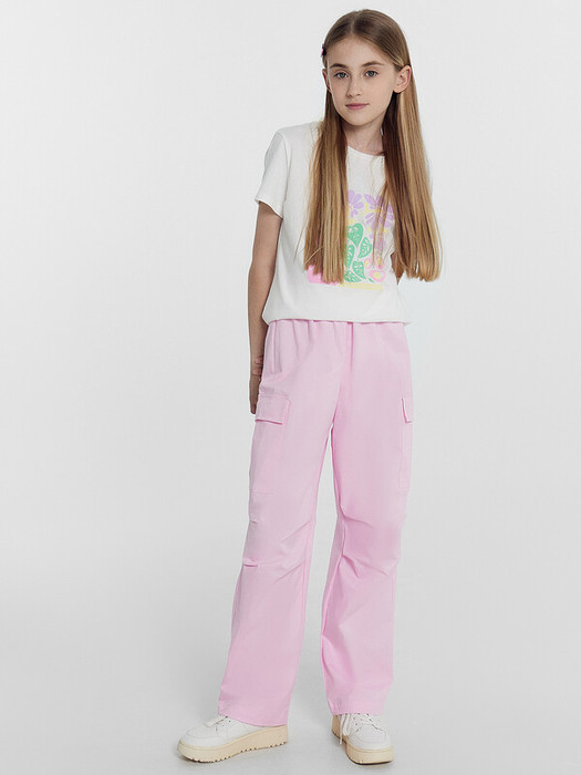 Брюки для девочек осенне-зимнего ассортимента. Брюки карго, посадка высокая. Пояс отрезной  с эластичной тесьмой внутри Rv40, образуют сборку. По поясу проложены отделочные строчки. На передних деталях карманы с отрезным бочком. По боковым швам накладные карманы с клапаном. На середине колена, передней детали заутюженные декоративные складки. По низу брюк подгибка с эластичной тесьмой с фиксаторами, образует сборку.