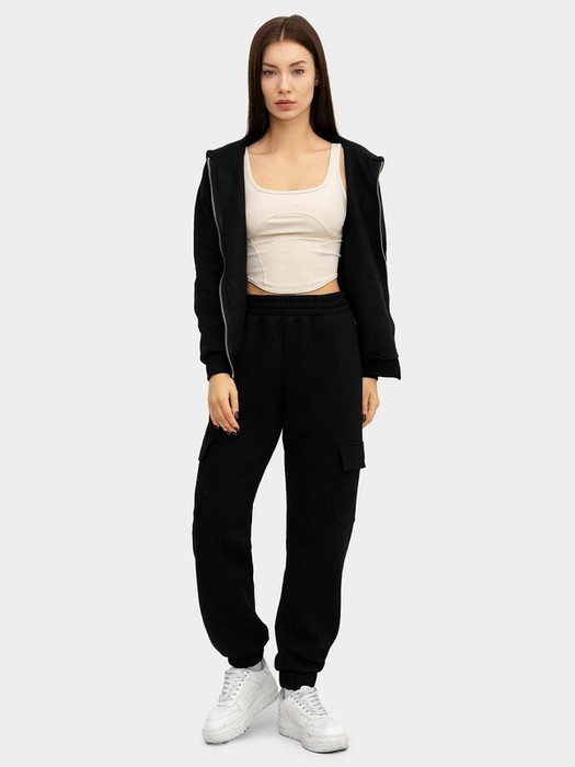 Женские брюки карго из трикотажного футера с теплым и нежным подчесом. Силуэт свободный. Есть не только боковые карманы, но и накладные карманы с клапаном. Пояс с эластичной тесьмой внутри. Брюки завершаются манжетой с эластичной тесьмой внутри. Стильные брюки для модных городских образов!
