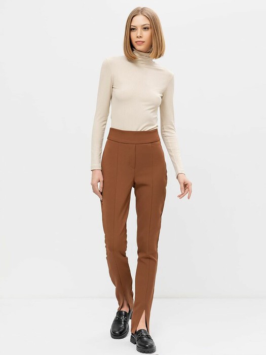 Женские брюки облегающего силуэта из приятной эластичной ткани. Широкий пояс и чуть завышенная талия дарят особый комфорт. Брюки застегиваются с помощью потайной застежки-молнии, гульфик является имитацией. По всей длине передней части брюк проходят стрелки-швы, которые внизу завершаются актуальными разрезами. Рекомендуем!