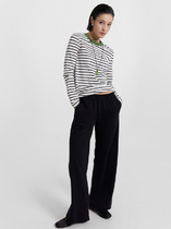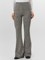 Брюки женские прямого силуэта из ткани. На деталях переда карманы с отрезным бочком. Пояс отрезной состоит из двух частей, задняя часть пояса присборена на резинку. Посадка средняя.