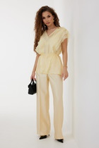 Брюки прямые, свободного силуэта. Посадка средняя, сиденье опущено. Пояс цельнокроеный с эластичной тесьмой внутри (вн. 20мм 20RV). В боковых швах обработаны карманы. Подкладка кармана из основного полотна. Нижние срезы обработаны швом вподгибку.