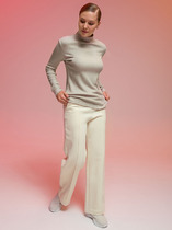 Брюки изготовлены из трикотажного полотна футер. Брюки прямые с высокой посадкой. Пояс отрезной из рибаны с эластичной тесьмой внутри. В передней части пояса с лицевой стороны пробиты петли и втянут шнур. Шов втачивания пояса распошит. Спереди обработаны карманы хулиганы. По низу брюк отрезные манжеты из рибаны.