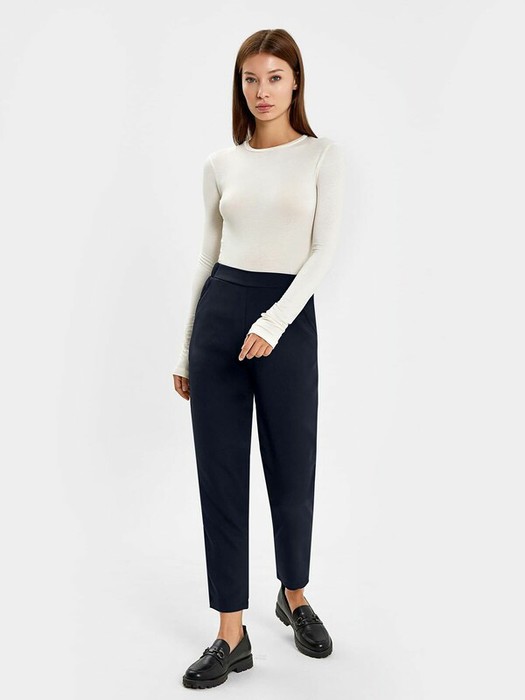 Брюки женские прямого силуэта из ткани. На деталях переда карманы с отрезным бочком. Пояс отрезной состоит из двух частей, задняя часть пояса присборена на резинку. Посадка средняя.