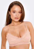 Бюстгальтер мягкий  из эластичной сетки, без каркасов. Чашка с вытачкой. Низ обработан широкой бейкой из основного полотна с эластичной тесьмой внутри, с отделочной строчкой контрастными текстурированными нитками. Передний срез и проймы чашки обработаны с контрастной строчкой текстурированными нитями и жилкой по изнаночной стороне. Передняя часть бретели выворотная из основного полотна с жилкой внутри. Надставки бретелей по спинке из бретелечной тесьмы  с регулировкой. Кольца-регуляторы. Застежка двойная.