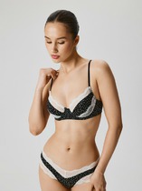 Бюстгальтер женский, t-shirt. С жесткими формованными чашками без каркасов. Чашки из хлопка, с вытачками. По линии декольте и по пройме чашки обтачаны полотном. Отрезные бочки из хлопка. В боковых швах пластины. Верхний срез бочка обработан жесткой тесьмой. По нижнему среза стана настрочена декоративная тесьма с жесткой тесьмой с изнаночной стороны. Бретель с регулировкой по размерам. Застежка двойная.