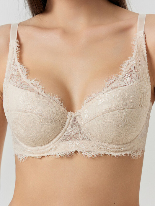 Бюстгальтер макси, каркас 85 тип, из эластичного кружева.  Верхняя деталь чашки из эластичного кружева с тройным членением, отлетная по верхнему краю. С изнаночной стороны настрочена эластичная тесьма 4 мм (жилка тканая Wt4-4, девсел 13460W). Нижняя деталь чашки с тройным членением из дубляжа.