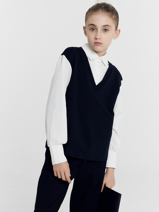Джемпер свободного силуэта, с имитацией жилетки и рубашки. Жилет из селаника горловина V-образной формы. Рубашка из ткани горловина круглой формы, воротник с цельнокроенной стойкой. По переду центральная застежка на пуговицы. Плечо спущено, пройма углубленна. Рукава втачные, длинные из ткани. Низ рукава немного расширен и присборен, по низу рукава отрезная манжета из ткани. Низ изделия обработан швом в подгибку.