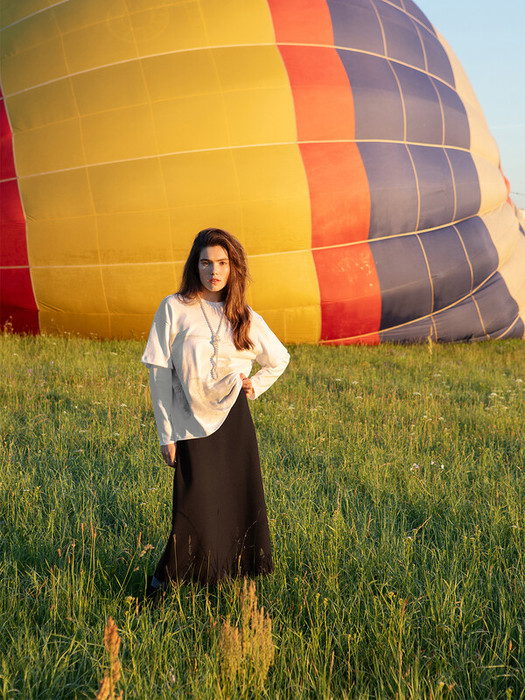 Джемпер женский свободного силуэта из трикотажного полотна кулирка и рибана. Горловина круглой формы, обтачка горловины из рибаны. Плечо спущено, пройма углублена. Рукав втачной, двойной, короткий и длинный. Нижние срезы обработаны швом вподгибку.
