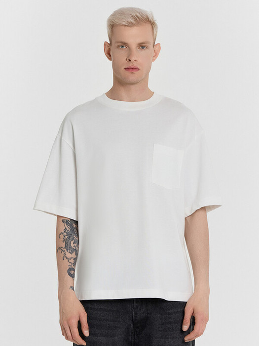 Футболка свободная укороченная, оверсайз. Горловина округлой формы обработана обтачкой из рибаны. Рукава втачные, корткие. Линия плеча спущена. На детали переда накладной карман (мод 111899-1). Нижние срезы футболки и рукавов обработаны швом вподгибку.