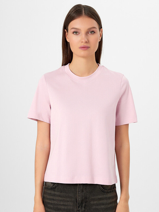 Футболка прямого силуэта из трикотажного полотна кулирка. Горловина круглой формы, широкая обтачка из рибаны.