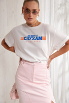 Футболка силуэта оверсайз из трикотажного полотна кулирка. Горловина круглой формы, обтачка горловины из рибаны. Шов горловины спинки закрыт бейкой из основного полотна.