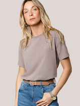 Нижние срезы футболки и рукавов обработаны швом вподгибку.