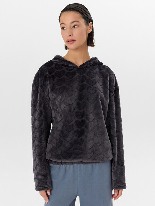 Худи домашнее женское с меховым ворсом — это уютное и стильное решение для комфортного отдыха. Модель свободного силуэта выполнена из мягкого трикотажа с меховым ворсом, который обеспечивает тепло и нежность прикосновения к коже. Круглая горловина с капюшоном и длинные рукава дарят ощущение защищенности, а эластичный пояс по низу мягко фиксирует худи, не стягивая талию.