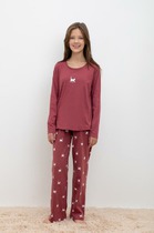 Уютный комплект для девочек, состоящий из джемпера с длинными рукавами и брюк. Джемпер свободного силуэта. Перед и спинка цельнокроеные. Горловина круглой формы из основного полотна. Рукава втачные, низ рукавов с притачными манжетами. Брюки прямые, с притачными манжетами. Пояс с эластичной тесьмой, которая обеспечивает отличную посадку. Стильная и комфортная детская пижама — лучший вариант для прохладного времени года. Широкий размерный ряд, красивые расцветки моделей в линейке. Рекомендуем!