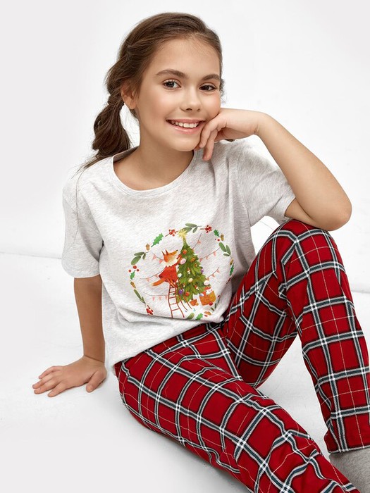 Уютная и красивая пижама для девочек. Выполнена из хлопковой трикотажной кулирки. В комплект входят футболка и брюки. Футболка с круглым вырезом, короткими рукавами. Свободный силуэт и классическая длина обеспечивают комфорт. Брюки длинные, слегка заужены к низу, с тесьмой в поясе. Комфортно и очень красиво!