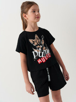 Легкий и привлекательный комплект из трикотажной кулирки. Включает необычную футболку и мини-шорты. Футболка прямого силуэта, длиной до середины ягодиц, с круглой горловиной и необычными короткими рукавами, украшенными рюшами. Шорты короткие, с боковыми карманами и эластичной резиной в поясе. наверняка понравится вашей девочке!