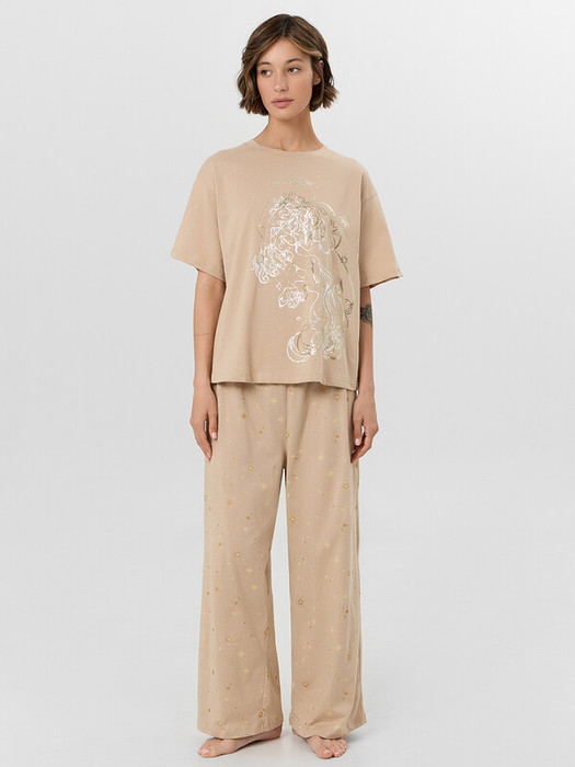 Джемпер прямого силуэта до середины бедра. Полочка и спинка цельнокроеные. Горловина круглой формы, обработана бейкой, отстрочена. Рукава втачные, короткие. Низ рукавов и джемпера обработаны швом вподгибку.