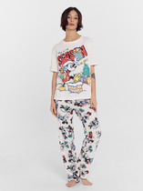 Горловина круглой формы с притачной обтачкой из основного полотна. Рукава длинные втачные. Перед и спинка цельнокроеные. Низ джемпера и рукавов обработан швом в подгибку. Брюки длинные, немного заужены к низу. Пояс цельнокроенный с эластичной тесьмой внутри. Низ брюк застрочен с эластичной тесьмой внутри.