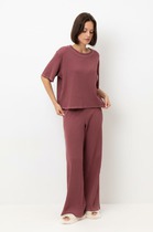 Брюки прямые, свободные. Посадка средняя. Пояс цельнокроеный с эластичной тесьмой внутри.