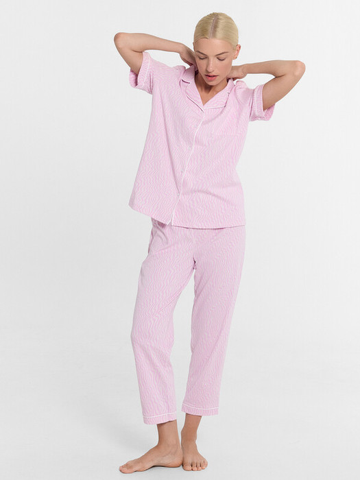 Комплект женский состоит из жакета и бридж. Жакет прямого силуэта, спинка цельнокроеная. На левой детали переда накладной карман (по заданию). Горловина оформлена отложным воротником с лацканами. Край борта и воротника оформлен кантом. Рукав втачной короткий, низ рукава обработан манжетой с втаченным кантом. Жакет с центральной застежкой с петлями и пуговицами. Низ застрочен швом в подгибку.