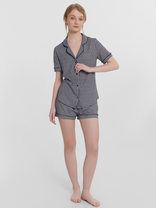 Хлопковый женский комплект актуального свободного силуэта. Рубашка прямая, с отложным воротником и лацканами, короткими рукавами, застегивается на пуговицы. Дополняют ее свободные шорты длины мини, с резиновой тесьмой в поясе и атласной тесьмой, которая завязывается на бантик. Особенность модели – контрастные канты на рукавах, воротнике и  передней части рубашки. Рекомендуем для сна, отдыха и домашних дел!
