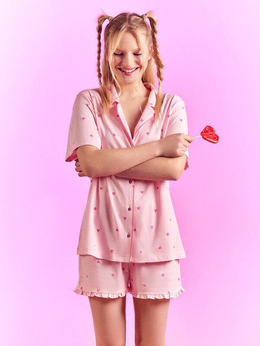 Эта красивая женская пижама свободного силуэта, выполненная из высококачественного хлопка, подарит вам комфорт на весь день и всю ночь. Горловина рубашки оформлена отложным воротником с лацканами, по краю которого проходит атласный кант, добавляющий изысканности и элегантности. Короткие рукава делают рубашку идеальной для теплой погоды, а центральная застежка на пуговицах обеспечивает удобство и стиль. Шорты свободного силуэта, декорированные рюшами по низу, добавляют образу очарования и женственности. Хлопковый материал обеспечивает легкость и приятные ощущения на коже, при этом пижама не жаркая, благодаря легкой и слегка тянущейся ткани, которая не сковывает движений. Эта модель подойдет как для сна, так и для домашних дел.