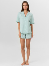 Эта красивая женская пижама свободного силуэта, выполненная из высококачественного хлопка, подарит вам комфорт на весь день и всю ночь. Горловина рубашки оформлена отложным воротником с лацканами, по краю которого проходит атласный кант, добавляющий изысканности и элегантности. Короткие рукава делают рубашку идеальной для теплой погоды, а центральная застежка на пуговицах обеспечивает удобство и стиль. Шорты свободного силуэта, декорированные рюшами по низу, добавляют образу очарования и женственности. Хлопковый материал обеспечивает легкость и приятные ощущения на коже, при этом пижама не жаркая, благодаря легкой и слегка тянущейся ткани, которая не сковывает движений. Эта модель подойдет как для сна, так и для домашних дел.