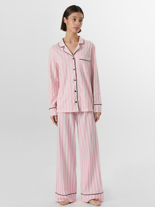 Брюки прямого свободного кроя с средней посадкой на талии создают максимальный комфорт. Широкий пояс со скрытой мягкой резинкой бережно облегает фигуру, не создавая давления, а элегантные отрезные манжеты по низу с контрастными кантами гармонично завершают образ. Пижама обладает исключительной мягкостью, не вызывает раздражения кожи, сохраняет форму после многократных стирок.
